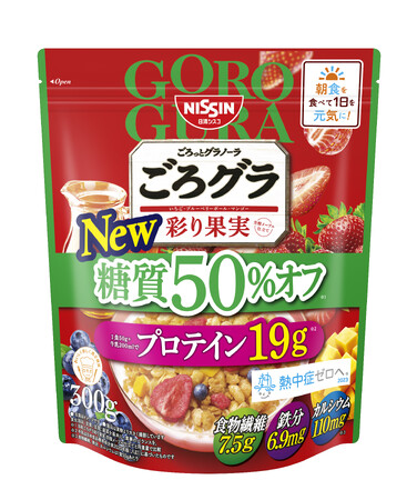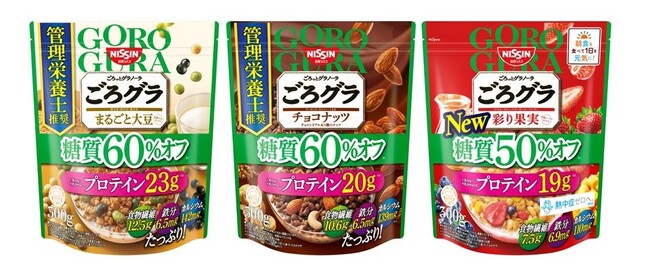「糖質60%オフ まるごと大豆」は、こんがり香る黒蜜きなこ仕立てのシリアル生地に、3種の大豆(黒大豆、黄大豆、青大豆)がたっぷり。「糖質60%オフ チョコナッツ」は、こだわりのカカオを使用したコク深いチョコ風味のシリアル生地に3種のナッツ(アーモンド、カシューナッツ、くるみ)がたっぷり入った、豊かな味わいを楽しめます。「糖質50%オフ 彩り果実」は、2種類のメープルシロップで味付けした芳醇なメープル味のシリアル生地に、大きめスライスいちご、粒いちご、ブルーベリーボール、マンゴーがたっぷり。どれも、「ごろグラ」らしいリッチな味わいをお楽しみいただけます。