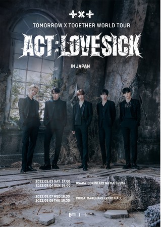 韓国5人組ボーイグループTOMORROW X TOGETHER(SOOBIN、YEONJUN、BEOMGYU、TAEHYUN、HUENINGKAI)の待望の日本初オフライン公演『TOMORROW X TOGETHER WORLD TOUR <ACT : LOVE SICK> IN JAPAN』が、9月3、4日(大阪・おおきにアリーナ舞洲)、9月7、8日(千葉・幕張イベントホール)にて開催することが決定しました。チケット販売スケジュールなど詳細については後日発表いたします。