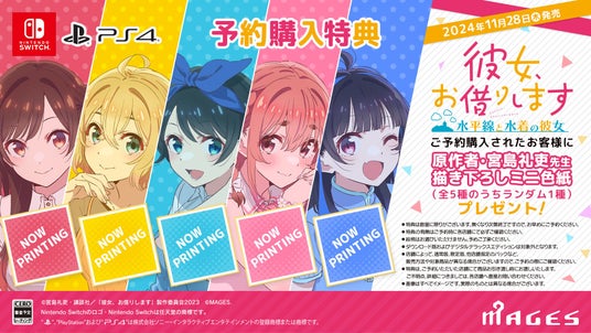 『彼女、お借りします ~水平線と水着の彼女~』をご予約購入されたお客様に、原作者・宮島礼吏先生描き下ろしのミニ色紙(全5種のうちランダム1種)をプレゼントいたします。