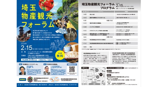 一般社団法人埼玉県物産観光協会(会長:朝霧重治)は、埼玉県全域の経営力向上や稼ぐ観光地域づくりを推進するため、行政、DMO、民間事業者の皆様を対象とした「埼玉物産観光フォーラム」を開催することといたしましたのでお知らせいたします。