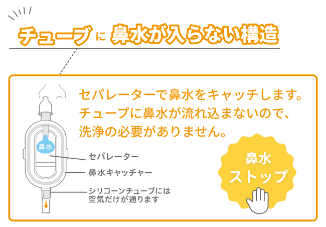 「鼻水キャッチャー」の内部を2層構造にしたことで、チューブへの鼻水の流れ込み防止機能を強化。チューブに鼻水が入らないため、吸引後は「フィット鼻ノズル」と「鼻水キャッチャー」を洗うだけで、簡単にお手入れができます。赤ちゃんのお鼻に入れるものだから簡単に清潔に保ちたい、そんなママ・パパの想いを実現しました。