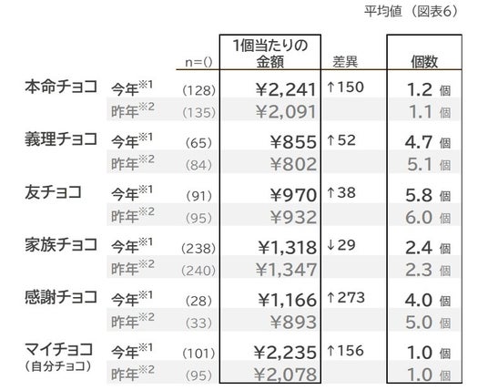 最も予算をかける予定なのは、「本命チョコ」で、1個当たりの金額は平均2,241円で、昨年から150円増加しています。次いで「マイチョコ(自分チョコ)」が高く2,235円でした。本命チョコとの差額6円とわずかな差でした。一方、「家族チョコ」は昨年と比較すると29円減少しました。