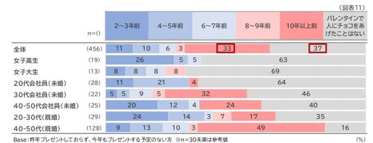 サンプル数の少なさから参考値になるが、女子高生、女子大生、20代会社員(未婚)は6割以上が未経験と回答、若年層はチョコレートのプレゼント未経験率が高くなる傾向が見られた。