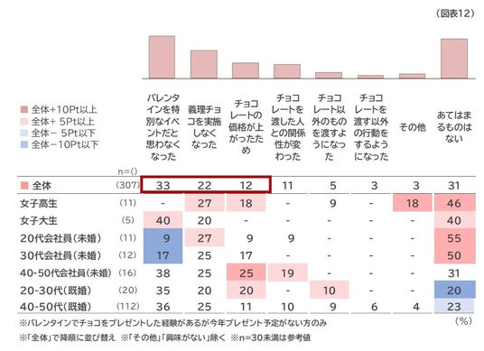 値上げの影響による変化を確認したところ、「すべてのチョコを渡すのをやめる」のは1割強という結果でした。「影響はない」と回答した方は昨年比で-8ptと昨今の値上げはバレンタインに影響を与えている可能性が示唆されます。