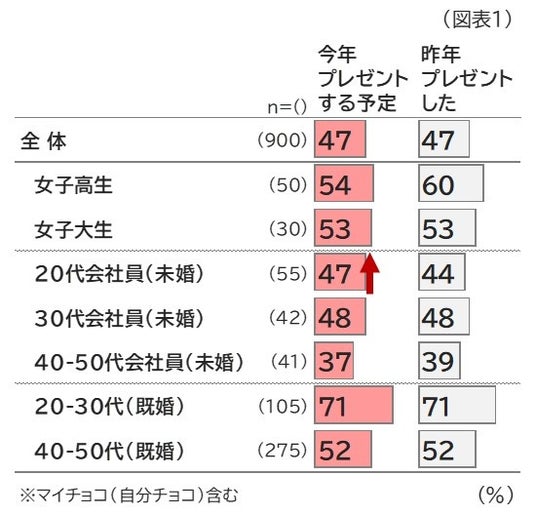 1.「今年チョコをプレゼントする予定」と回答した方は47%。昨年と比較して大きな変化は見られない。