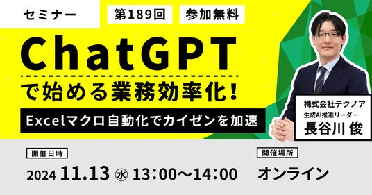 株式会社テクノア(本社:岐阜県岐阜市、代表取締役:山崎 耕治)は、2024年11月13日(水)13時より、ChatGPT活用術をテーマにした「ChatGPTで始める業務効率化!Excelマクロ自動化でカイゼンを加速」セミナーをオンラインで開催いたします。