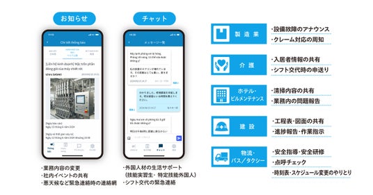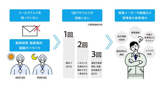 その背景には、業務上デジタルデバイスを利用する機会がほぼなく、業務用の端末やメールアドレスが付与されていないという現場従業員の特性があります。さらに、雇用形態・勤務時間・勤務場所・国籍が多様であることから、例えば業務連絡は朝礼や掲示板などを通じて行われていますが、何日間にも渡って同じ内容を伝えたり、日本語が不得手な外国人従業員には、通訳や監理団体、登録支援団体を通じて情報を伝える必要が生じています。