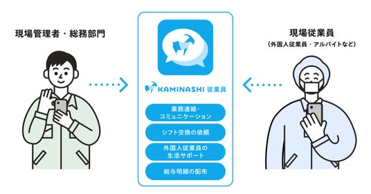 カミナシはこれまで「ノンデスクワーカーの才能を解き放つ」をミッションに掲げ、現場DXを支援してきました。新たに提供を開始する『カミナシ 従業員』は、現場管理者・総務部門と従業員間のあらゆる情報のやりとりを1つのサービス上で完結できるシステムです。例えば、現場管理者・総務部門は、従業員への業務連絡の一斉配信や既読管理、外国人従業員に対する生活面サポートのための連絡をスムーズに行うことが可能になります。また、現場従業員は管理者や他の従業員、総務部門に向けて、業務報告やシフトの交換依頼などを行うことが可能です。