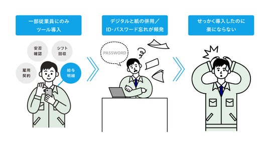 また、業務用端末やメールアドレスが付与されている一部の従業員にだけツールを導入しても、それ以外の従業員との連絡は紙や口頭のままとなるため、管理が煩雑になってしまったり、ツールによっては使用頻度の少なさからIDやパスワード忘れの問い合わせが頻発するケースも多く存在します。