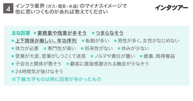 インフラ業界のマイナスイメージは「業務量や残業が多そう」「つまらなさそう」
