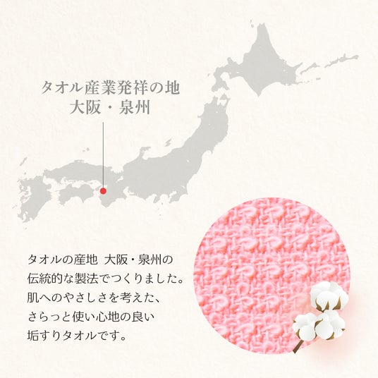 タオルの産地、大阪泉州の伝統的な製法でつくりました。肌へのやさしさを考えた、さらっと使い心地の良いあかすりタオルです。
