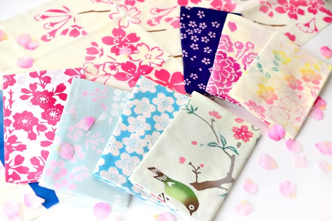 てぬぐい専門店「かまわぬ」の商品を金魚柄や季節の絵柄まで多数取り揃えています。春限定で並ぶ桜柄は、館内の作品演出でも表現している八重桜や夜桜などをはじめ約10種類の柄をご用意。