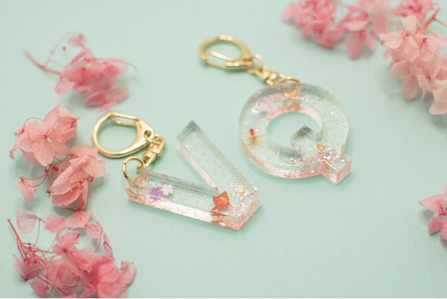 キーホルダーのなかに、金魚と桜の花びら、さらにゴールドのラメが鮮やかに輝くキーホルダー。アルファベットのなかにも広がる“金魚×桜”の春らしい彩りがとっても可愛いキーホルダーです。