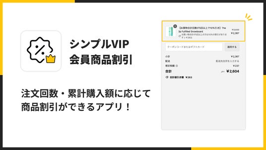 「シンプル VIP 会員商品割引|お手軽 VIP 商品セール設定」は、顧客の注文回数・累計購入額に応じて設定した商品を割引したり、無料にしたりできるアプリです。