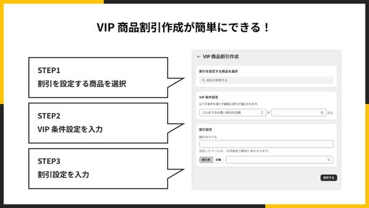 「シンプル VIP 会員商品割引|お手軽 VIP 商品セール設定」では、条件を満たす顧客に対して任意の割引率・定額割引により割引を適用できます。