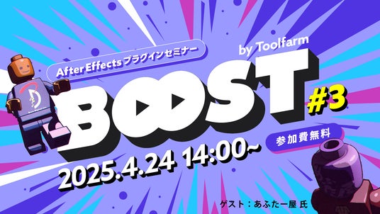 「もっとプラグインを使いこなしたい」「他のクリエイターの技を学びたい」「AEプラグインに興味がある」--そんな方にぴったりのセミナー『Boost!by Toolfarm』の第三回を開催いたします。