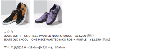 Vans Skate Classicsからは、Skate Sk8-Hiに“泥棒猫”ナミ、Skate Old Skoolに“悪魔の子”ニコ・ロビンの手配書がプリントされたアッパーで、アウトソールにONE PIECEのロゴがあしらわれたデザインが特徴の2足がラインナップされています。