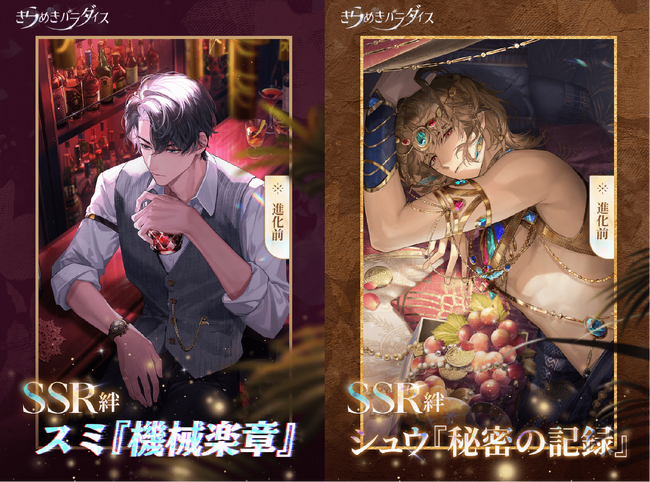 光の行方-VVANNAの夜・群青では、スミ『機械楽章』、シュウ『秘密の記録』のSSR絆が登場します。進化後の姿もお楽しみに!