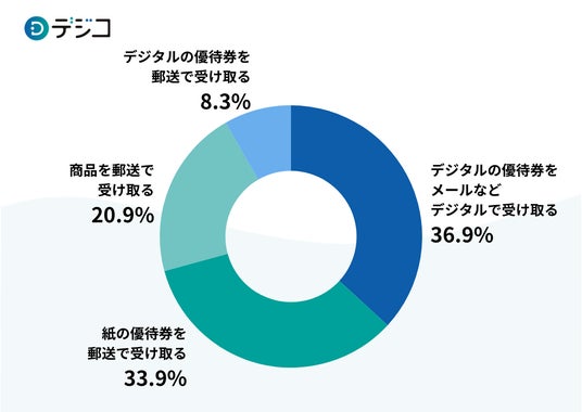 株主優待の受け取り方法として最も好ましいものを尋ねたところ、「デジタルの優待券をメールなどデジタルで受け取る」方法が最も多く36.9%、次いで「紙の優待券を郵送で受け取る」が33.9%となりました。「商品を郵送で受け取る」方法は20.9%で、「デジタルの優待券を郵送で受け取る」が8.3%という結果です。