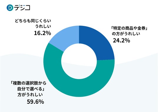 株主優待の内容について、「特定の商品や金券を受け取ること」と、「複数の選択肢から自分で選べること」のどちらの方がうれしいかを尋ねたところ、「特定の商品や金券を受け取る」方がうれしいと答えたのは24.2%、一方で「複数の選択肢から自分で選べる」方がうれしいと答えたのは59.6%、また「どちらも同じくらいうれしい」は16.2%でした。
