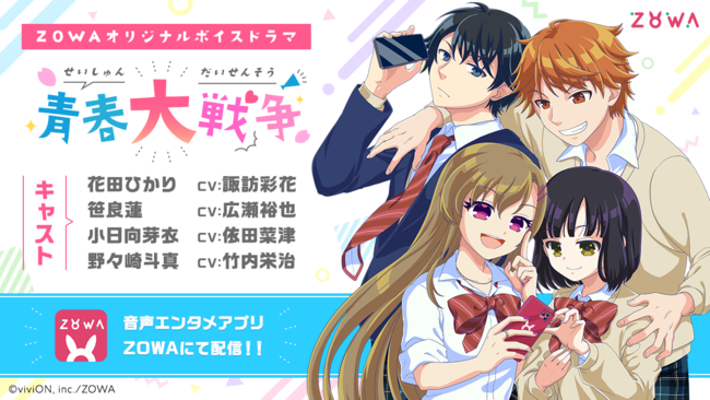 音声・動画の配信サービス『ZOWA』(株式会社viviON、所在地:東京都千代田区、代表取締役:明石耕作)は、諏訪彩花、広瀬裕也、依田菜津、竹内栄治が出演する、恋と友情を描いたボイスドラマ「青春大戦争」を3月30日(木)に配信いたします。主題歌は少年Tがこの番組の為に書き下ろした同タイトルの楽曲「青春大戦争」。卒業、入学シーズンの春にぴったりの元気でさわやかな楽曲に仕上がっています。是非、ボイスドラマと音楽のコラボをお楽しみ下さい。