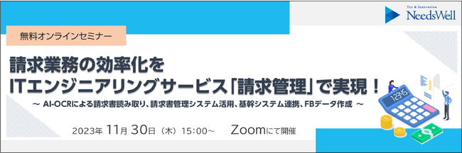 株式会社ニーズウェル(本社:東京都千代田区、代表取締役社長 船津浩三)は、2023年11月30日(木)15時より“請求業務の効率化をITエンジニアリングサービス「請求管理」で実現!~AI-OCRによる請求書読み取り、請求書管理システム活用、基幹システム連携、FBデータ作成~”、を開催します。