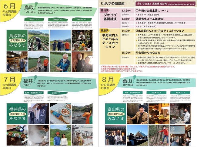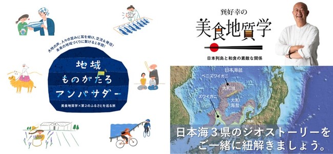 西日本旅客鉄道株式会社は、沿線自治体をはじめとした地域の皆様との協働による西日本エリアの活性化に向けた取り組みのひとつとして、関係人口の創出に取り組んでおります。この度、JR西日本は、富山県、福井県、公益社団法人 福井県観光連盟、鳥取県、株式会社JR西日本コミュニケーションズ、ジオリブ研究所合同会社、株式会社地域ブランディング研究所、一般社団法人Work Design Labと共同して、「地域ものがたるアンバサダー ~美食地質学×第2のふるさとを巡る旅~」を2022年6月から活動開始しております。 そのキックオフにあたり、3県各地の会場を巡回する形で「ジオリブ公開講座」を行いますのでぜひ現地会場およびオンラインにてご参加ください。