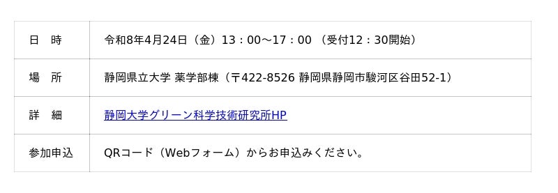 本シンポジウムは、静岡大学グリーン科学技術研究所が主管となり、静岡県内の5大学(静岡大学、静岡県立大学、浜松医科大学、静岡理工科大学、東海大学静岡キャンパス)の異分野交流を含めた多様な研究連携を深めることを目的として開催されます。