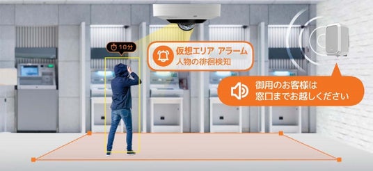 - カメラとレコーダーを用いてスピーカーから音声出力が可能です。例)ATMエリアでの徘徊検知時に「御用のお客様は窓口までお越しください」というアナウンス