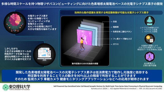 東京理科大学 先進工学部 電子システム工学科の生野 孝准教授、東京理科大学大学院 先進工学研究科 電子システム工学専攻の小松 裕明氏(2024年度 博士課程2年)、細田 乃梨花氏(2024年度 修士課程2年)の研究グループは、光強度を変化させることで時定数(*1)を制御できる色素増感太陽電池(DSC, *2)ベースの光電子シナプス素子(*3)を開発することに成功しました。また、開発したデバイスを物理リザバコンピューティング(PRC, *4)に応用したデバイスが、消費電力を抑えつつ、人の動きを高い精度で識別できることを実証しました。