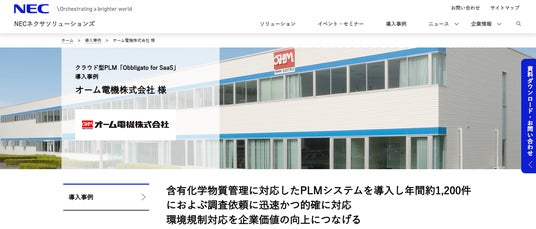 NECネクサソリューションズ株式会社(本社:東京都港区、代表取締役執行役員社長:木下 孝彦、以下 NECネクサソリューションズ)はオーム電機株式会社(本社:静岡県浜松市、代表取締役社長:戸塚 欣史郞、以下 オーム電機)に含有化学物質管理機能を備えたクラウド型PLM(Product Lifecycle Management)サービス「Obbligato for SaaS」を導入しました。これによりオーム電機は、年々増加する顧客からの含有化学物質調査依頼への迅速かつ的確な対応を実現します。