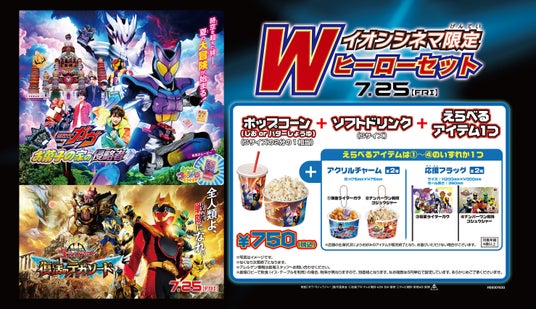全国に「イオンシネマ」96劇場を運営するイオンエンターテイメント株式会社(本社:東京都港区、代表取締役社長 藤原信幸)は、7月18日(金)より、映画『仮面ライダーガヴ お菓子の家の侵略者』映画『ナンバーワン戦隊ゴジュウジャー 復活のテガソード』公開を記念して、全国イオンシネマ87劇場でイオンシネマ限定「Wヒーローセット」をロビー飲食売店にて販売いたします。
