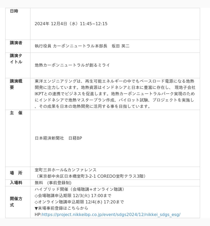 東洋エンジニアリング株式会社はNIKKEI SDGs FESTIVALのプログラムのひとつであるSDGs/ESG会議において、「地熱カーボンニュートラルが創るミライ」というテーマで12/4(水)に登壇予定ですので、是非ご聴講ください。