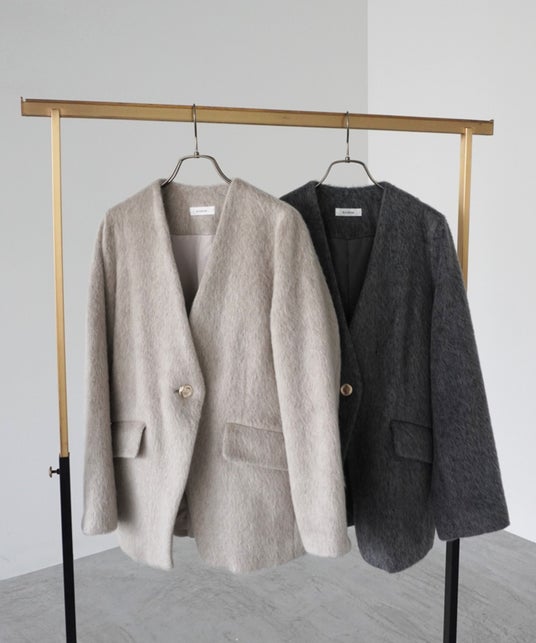 モヘア高混率の糸を使用したシャギー素材で、毛足が長いため手触りが非常にやわらかく、光沢感があり上品な印象。軽くて保温性が高く、吸湿性も良い、自信を持ってお届けできるアウターです。