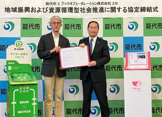 ブックオフグループホールディングス株式会社(本社:神奈川県相模原市、代表取締役社長:堀内康隆)の子会社で、リユースショップ「BOOKOFF」等を運営するブックオフコーポレーション株式会社(以下、ブックオフ)は、リユース・リサイクル事業の仕組みを活かした取り組みを通じた、地域振興および資源循環型社会を推進を目的とし、秋田県能代市(市長:齊藤滋宣)と「地域振興および資源循環型社会推進に関する協定」を2025年8月1日(金)に締結いたします。書籍の寄贈やSDGs×キャリア教育の授業「学校ブックオフ」実施で、地域の子どもたちへの読書機会創出と教育支援を行うほか、市庁舎等へ不要品回収ボックスを設置することで廃棄物削減を推進し、持続可能な地域社会の発展を目指してまいります。