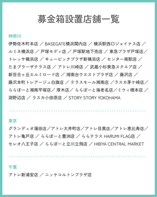 - 実施内容:各店舗の店頭レジ付近に募金箱を設置