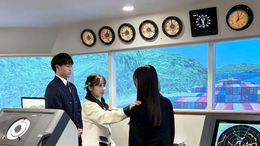シミュレータ室での操船体験後には女子学生との座談会も実施。恋愛事情について「クラス内や実習での出会いもあります」との回答に、「恋愛禁止だったりするのかな、と思ってた。そうなんだ、皆さん青春しているんですね」と驚きの声が上がった。