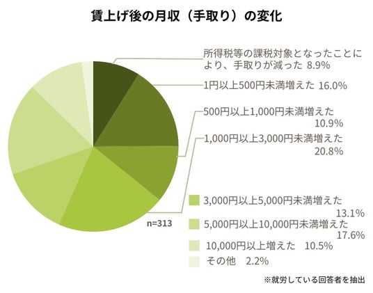 また、賃上げがあったと回答した人においても、その内容は限定的で、約半数が月3,000円未満の手取り増にとどまっています。