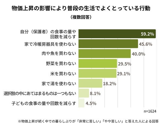 また、同質問で暮らしぶりが「非常に苦しい」「やや苦しい」と回答した人に対し、「物価上昇の影響により、普段の生活でよくとっている行動」について尋ねたところ、「自分(保護者)の食事の量や回数を減らす」が最も多く選択されました(複数回答)。