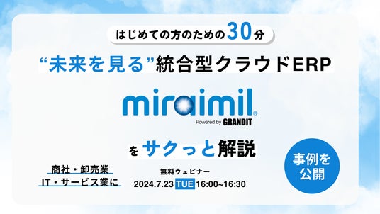 株式会社システムインテグレータ(本社:さいたま市中央区、代表取締役社長:引屋敷 智、東証スタンダード:証券コード3826)は、「未来を見る統合型クラウドERP『miraimil』をサクっと解説」と題した無料ウェビナーを7月23日(火)に開催することをお知らせします。