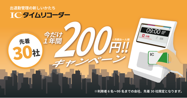 「ICタイムリコーダー」を提供する株式会社オープントーンが大幅割引キャンペーンを開始します。本キャンペーンは、新規及び既存の顧客に対し、通常月額250円のサービス料金を1年間、 200円に大幅値下げします。