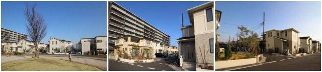 中央四丁目幸房公園に隣接する全40棟の分譲住宅です。電柱と電線の引込み計画を工夫し、公園側から電柱及 び電線が見えないように街並みをデザイン。人々が集う公園からの美しい風景が生まれ、良好な景観を維持しています。また夏季には南東から流れる心地よい風が街区内、建物内を流れ、公園側にも流れるよう街全体の通風設計、計算検証を行っています。さらに夜間の街並み醸成にも配慮し、センサーによる自動点灯LED 電飾による「灯りのいえなみ協定※」を行い、街の防犯対策に寄与しています。