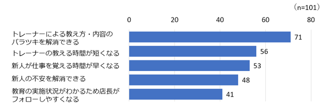 導入2ヶ月後、店長を対象にアンケートを実施。「実感した効果やこれから期待できる効果」について、時間短縮や不安解消に有効であるという回答が得られました。