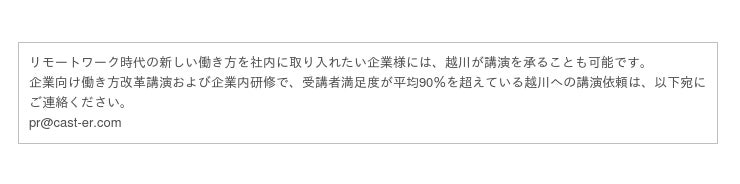 本書では、当社のリモートワーク導入コンサルティングサービス「Caster Anywhere」で事業責任者を務める越川が、これまでクライアント企業を支援してきた経験とデータを元に、リモートワーク時代に効率的に成果をあげる会議術をお伝えしています。