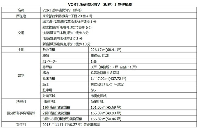 「区分所有オフィス(R)」を主軸に資産形成コンサルティングを行う株式会社ボルテックス(東京都千代田区 代表取締役社長 兼 CEO 宮沢 文彦、以下当社)は、「VORT浅草橋駅前V(仮称)」を取得しましたのでお知らせいたします。