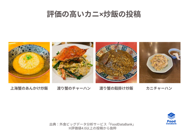 評価の高い(評価値4.0以上)投稿画像に注目すると、カニの身がごろっと入っていたり、甲羅ごと盛りつけされていたりと、味と見た目で存在感のある一品が高評価の傾向にあるようです。