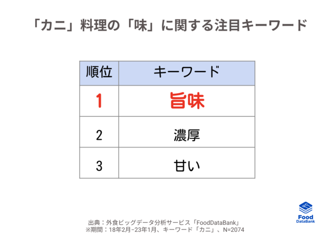 また、「カニ」料理を食べる際の「味」に関しての注目キーワードは「旨味」が第一位となり、カニ特有の強い旨味がポイントとなっていることが分かります。