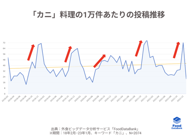 冬に旬を迎える品種の多い「カニ」について、外食ビッグデータ分析サービス「FoodDataBank」で調査したところ、投稿データからも旬の時期に「カニ」が多く食べられていることが分かりました。