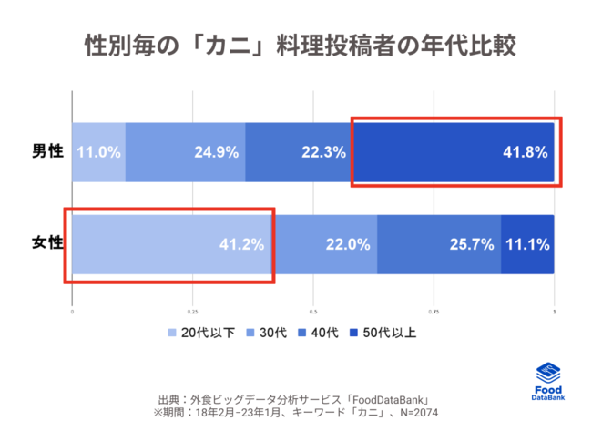 次に「カニ」についての投稿をしているユーザーの性別ごとの年代比率を見ていくと、男性は50代以上の割合が高いのに対して、女性は20代以下の割合が高い傾向にあります。