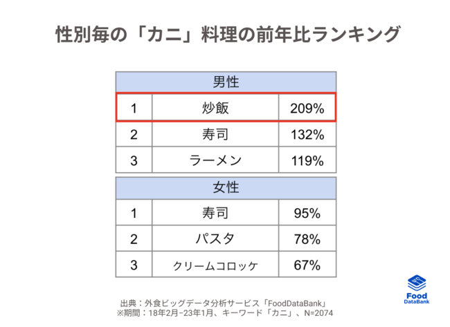 そこで、性別毎の「カニ」料理の前年比ランキングに注目してみると、特に男性側の「カニ×炒飯」が大きく伸長していることが分かりました。男性の好むカニを扱った料理では「炒飯」や「ラーメン」といったガッツリ系の料理との組み合わせが人気のようです。